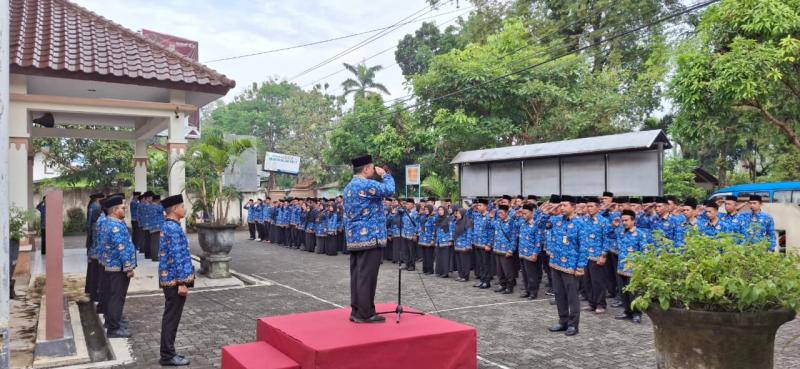 Pelaksanaan apel berlangsung khidmat dan tertib, diiringi dengan penghormatan kepada bendera merah putih serta menyanyikan lagu kebangsaan Indonesia Raya. Suasana penuh semangat terlihat dari kekompakan peserta apel yang mengenakan seragam Korpri berwarna biru.
