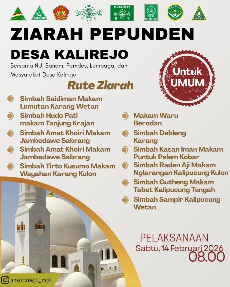 Kalirejo – Dalam upaya merawat tradisi spiritual dan menghormati jasa para leluhur desa, Pemerintah Desa (Perngkat Desa, BPD, PKK, Kader Kesehatan) Kalirejo bekerja sama dengan Pengurus Ranting Nahdlatul Ulama (NU), Badan Otonom (Banom), serta berbagai lembaga desa sukses menyelenggarakan kegiatan Ziarah Pepunden Desa Kalirejo, Sabtu (14/02/2026).